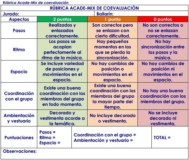 A modo de evaluación formativa, utilizaremos esta rúbrica para, simulando ser jurado, valorar la actuación de los bailarines/as. A modo de juego, también daremos puntos a las academias para al final seleccionar a la ganadora del concurso de baile.
